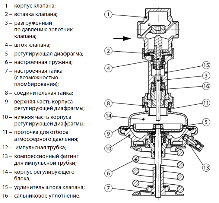 регулирующего клапана регулятора передается через импульсную трубку в мембранный блок и воздействует на регулирующую диафрагму с одной стороны.С другой стороны на регулирующую диафрагму действует