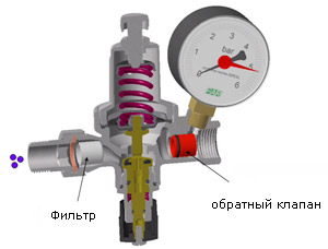 Редуктор подпитки– это устройство, позволяющее поддерживать автоматически требуемое давление в закрытой системе отопления. Использование редуктора позволяет автоматически компенсировать падение давления, вызываемое выпуском воздуха из контура через воздухоотводчики. Редуктор имеет встроенный фильтр 450 мкм и обратный клапан. Поставляется в комплекте с манометром.