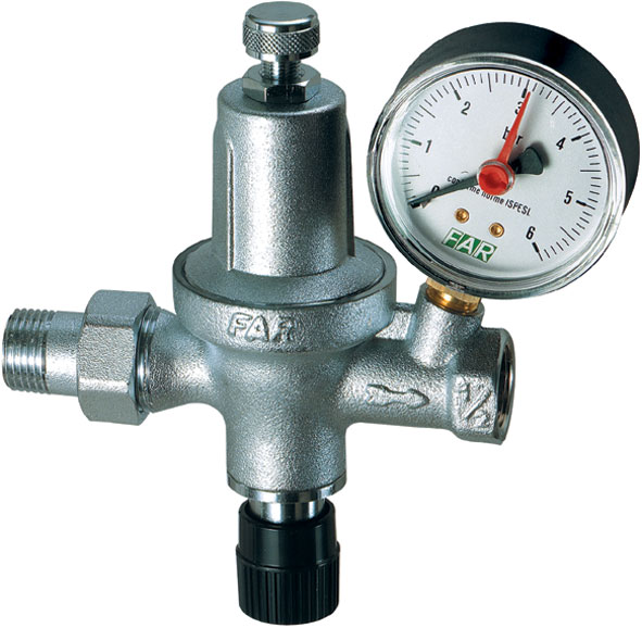 Хромированный автоматический редуктор давления FAR НР-ВР с манометром - редуктор давления для системы отопления
