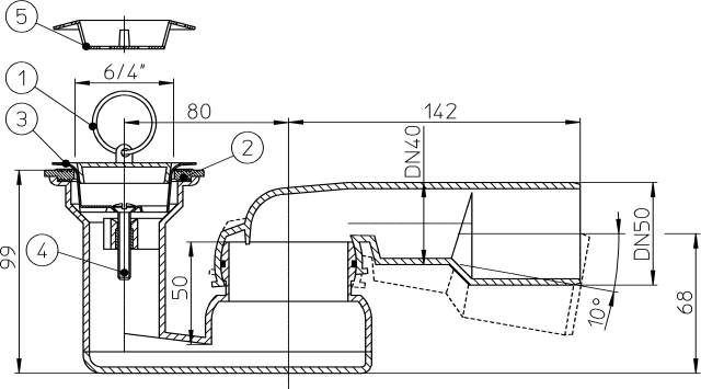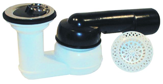 Сифон для душевого поддона со сливным отверстием 52мм, с поворотным шарниром 280° по горизонтали и 10° по вертикали, с пробкой 6/4", с пластиковой сеткой для улавливания волос и мелкого мусора. Высота гидрозатвора 50мм