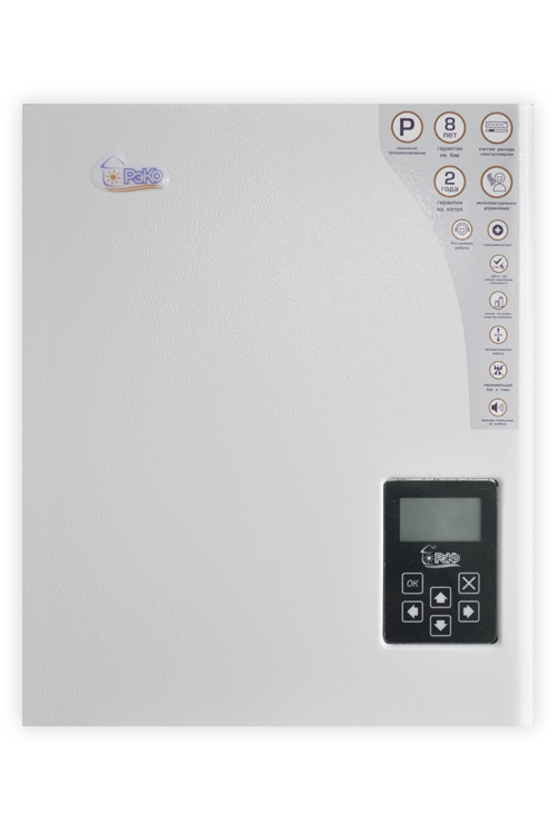 Управление электрическим котлом РЭКО осуществляется при помощи функциональной панели с ЖК-дисплеем, имеющей все необходимые индикации (информация о текущих температурах, режимах работы и