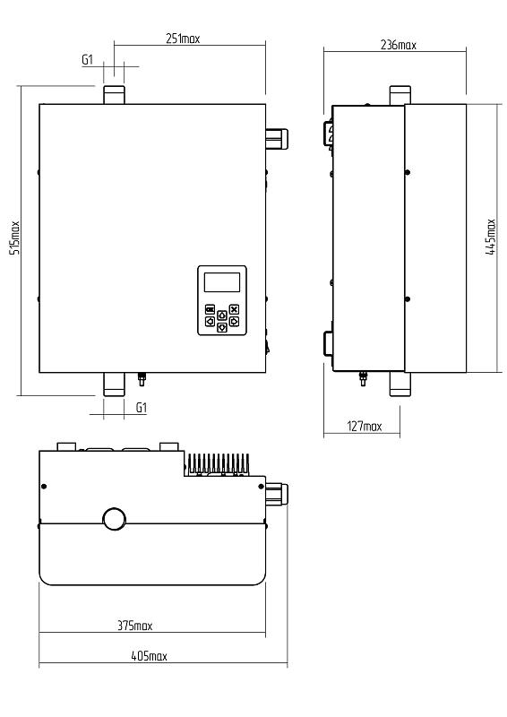 напряжением 380В. Предусмотрена как автоматическая так и ручная регулировка мощности: 6/9/15 кВт. Присоединительный размер патрубков 1".