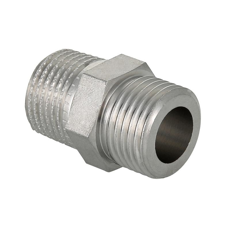 (VTi.582.I) Ниппель из нержавеющей стали в составе системы VT.INOX-PRESS предназначен для соединения элементов с внутренней резьбой равного диаметра. Резьба одного патрубка имеет насечки – для эффективного удержания уплотняющего материала. Шестигранный – под гаечный ключ – участок корпуса облегчает монтаж соединения. Материалом изделия служит сталь марки AISI 304, устойчивая к коррозии, химическому и термическому воздействию. Область рекомендуемого применения фитингов VT.INOX-PRESS чрезвычайно широка, однако исключает трубопроводы жидких углеводородов и хлороводородных растворов.