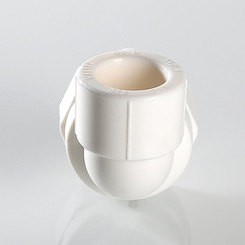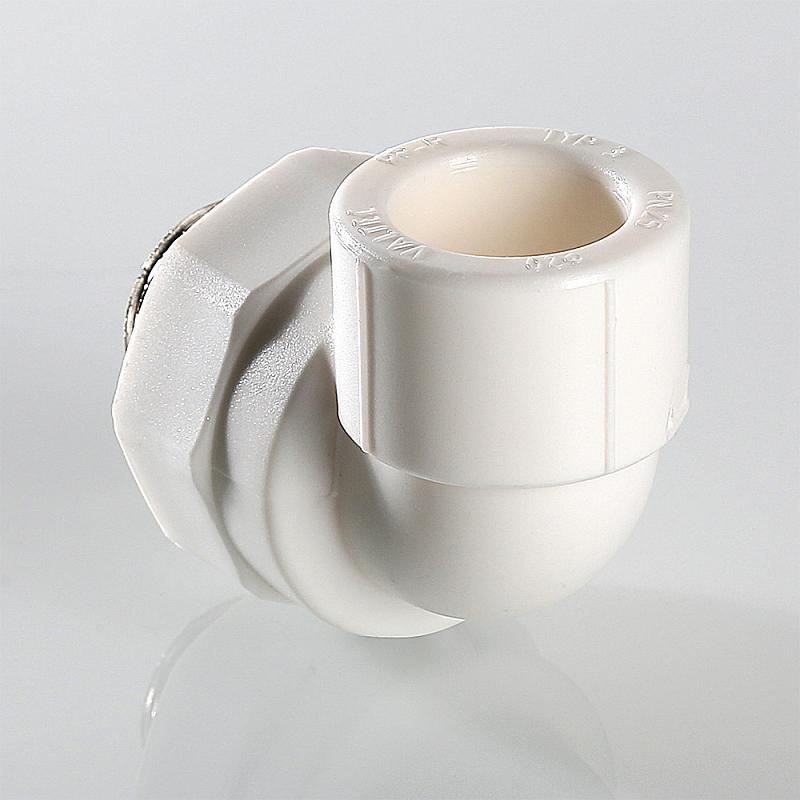 (VTp.753.0) Двухсторонний комбинированный фитинг (полипропиленовый фитинг) для соединения под углом 90° друг к другу полипропиленового трубопровода и компонента инженерной системы с резьбовым подключением. Резьба фитинга – наружная трубная по ГОСТу 6357. Предусмотрен участок корпуса шестигранной формы, под гаечный трубный рычажный ключ.
